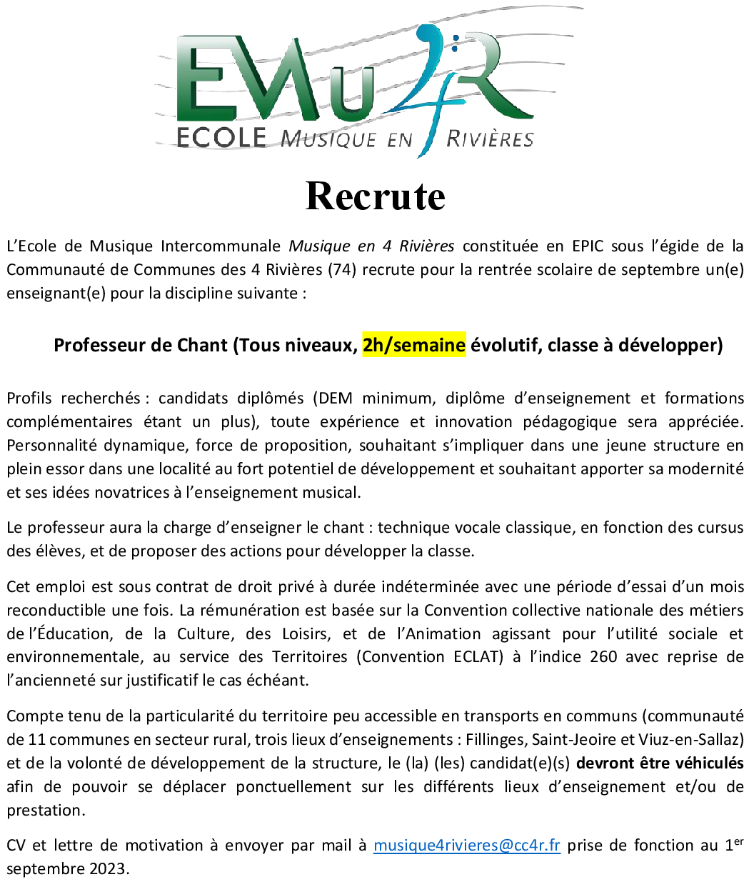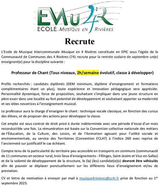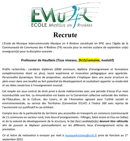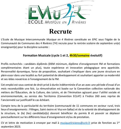 L'Ecole Musique en 4 Rivières recrute pour sa rentrée de septembre des enseignant(e)s dans les disciplines suivantes: